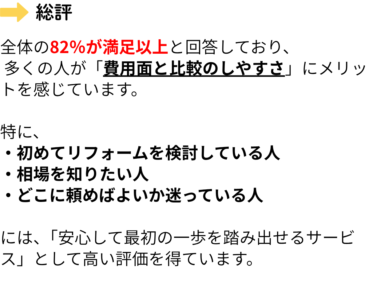 工事のメリットデメリットを詳しく説明してくれ、納得できる形で見積もりを取ることができました。また、複数の業者を比較することで予算内で希望通りの工事が可能になりました。