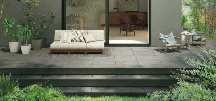 600角の大判タイルで、モダンで高級感のあるガーデン空間を演出。