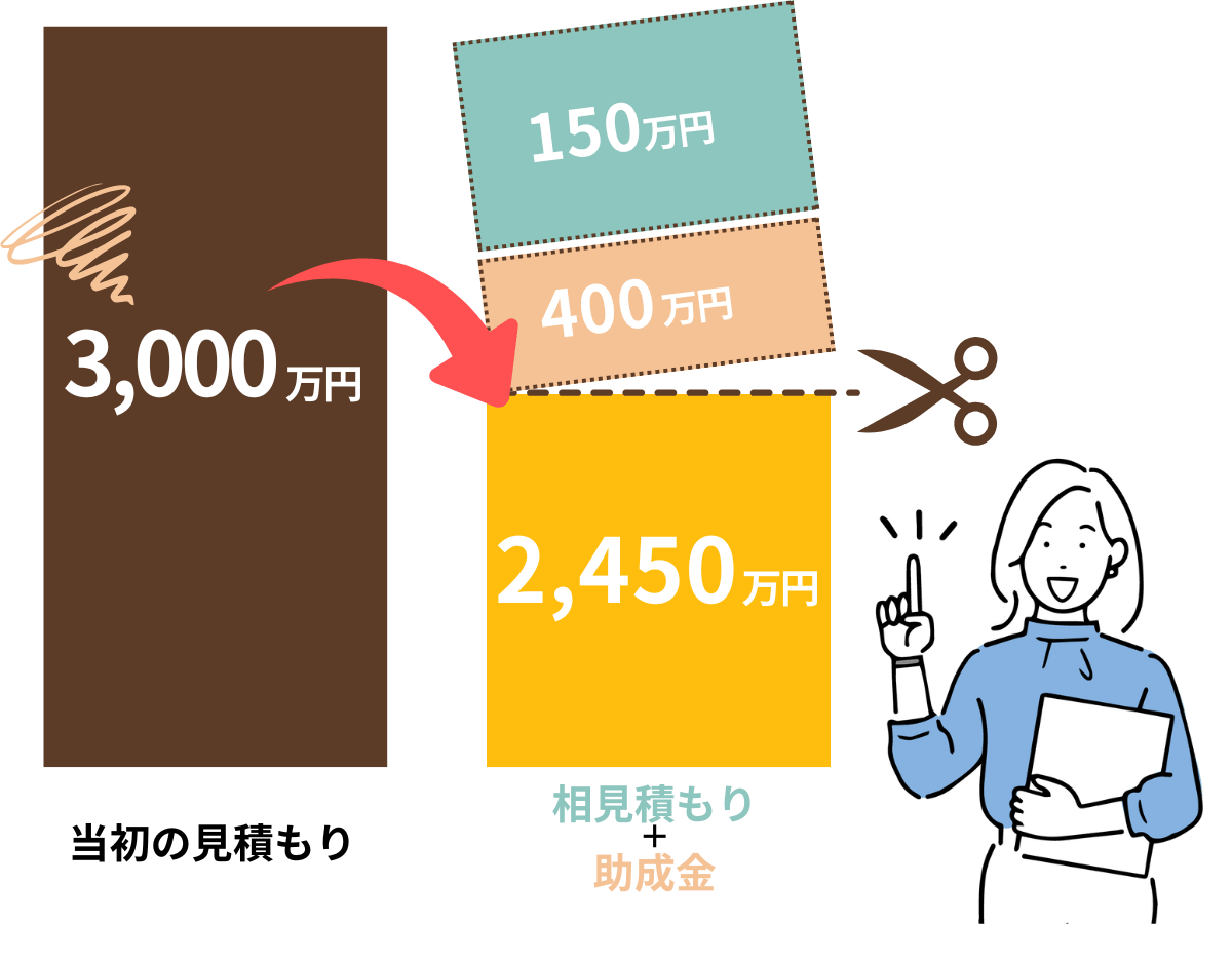 例えば、3,000万円の価格だと相見積もりと助成金を組み合わせることで550万円以上の金額がお得になる例もあります。