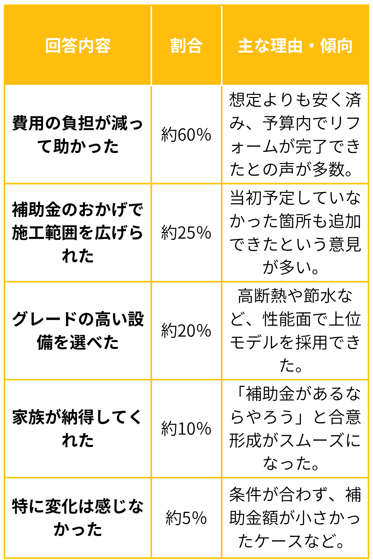 特に助かったのは、助成金対応の業者を紹介してもらえたことです。見積もりの段階では2番目に安い業者でしたが、助成金を活用することで、最終的に一番安いコストで工事を行うことができました。