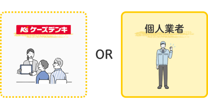 ダウンライト交換を依頼するルートは大きく分けて、「ケーズデンキ(店舗経由の専属・提携施工)」と、「地元の電気工事店・リフォーム会社」の2パターンがあります。どちらにも長所・短所があるため、費用だけでなく、保証や日程の取りやすさ、機器選定のサポート体制まで含めて比較するのがポイントです。