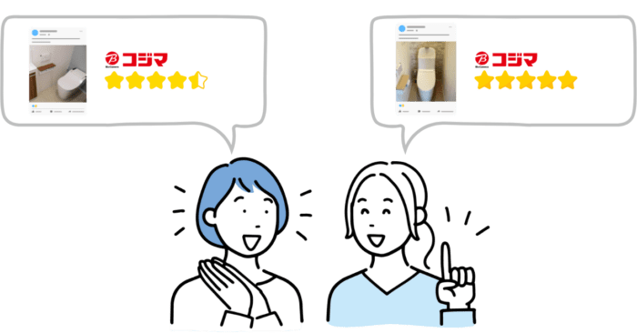 コジマ電気(コジマ×ビックカメラ)のトイレリフォームは、店頭相談やWeb申込からの現地調査~本体提案~設置工事~内装張替えまでをワンストップで依頼できる点が好評です。口コミでは見積の分かりやすさ・標準工事パックの安心感・工期の早さが評価される一方、上位機種やオプション追加で総額が上がるとの声もあります。ここでは実際にコジマ電気で施工したユーザーの声を整理しました。