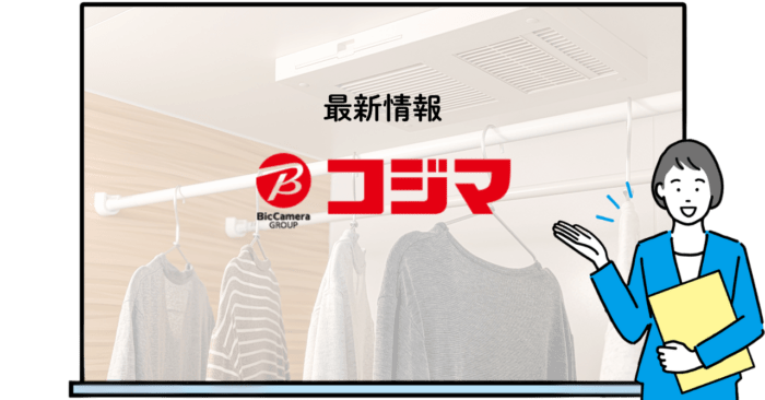 コジマ電気(コジマ×ビックカメラ)は、家電販売と住設リフォームのワンストップ体制を強みに、浴室乾燥機(暖房・換気・乾燥)の相談→現地調査→機種選定→施工→保証まで対応しています。近年はDCモーター採用・200V高出力・内部乾燥/抗菌・IoTリモコンなど高機能モデルの取り扱いが拡大。天井埋込の置換は原則1日完了の事例も多く、セール/ポイント/延長保証を組み合わせることで実質負担を抑えた交換がしやすくなっています。