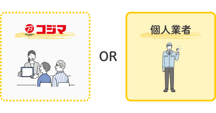 浴室乾燥機の交換を依頼する際には、主に「コジマ電気の直営・提携施工」に頼む場合と、「電気工事店やリフォーム会社(設備業者)」に頼む場合の二つの選択肢があります。どちらにもメリットとデメリットがあり、費用だけでなく追加工事(200V配線・ガス工事・ダクト調整など)の有無や保証まで考慮して選ぶことが重要です。