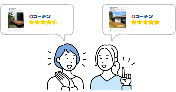 コーナンのウッドデッキは、DIY向けに組み立てやすいキット商品から、人工木や天然木を用いた本格的な施工プランまで幅広く展開されています。耐久性やデザイン性の高さで評価を得る一方で、「サイズ調整が難しい」「プロ施工に比べると仕上がりに差が出る」といった声もあります。ここでは実際にコーナンでウッドデッキを導入した方のリアルな口コミをまとめました。