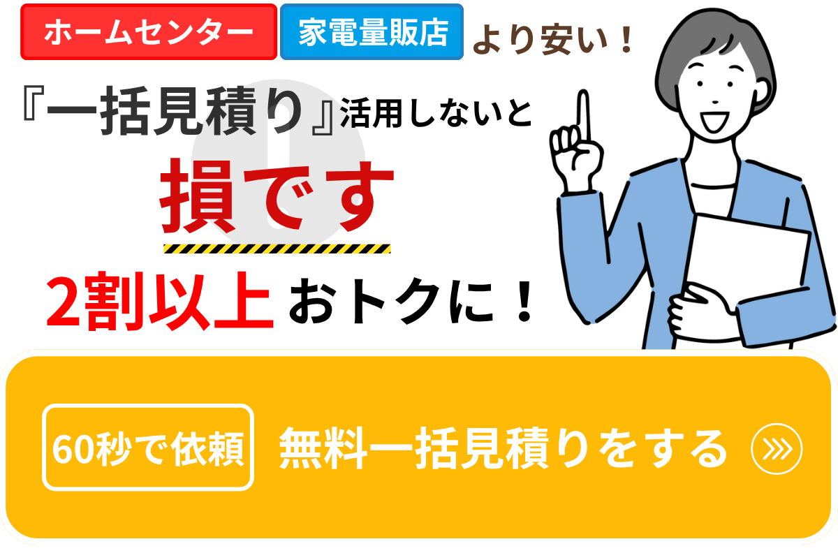 ホームセンターの表示価格は店頭参考価格(またはチラシ価格)がベースで、現地調査後の見積りで工事セット割・まとめ買い割・期間キャンペーン・会員ポイントなどが適用されることがあります。割引体系は時期・店舗・対象商品で異なるため、見積書の「商品」「施工」「撤去処分」「諸経費」を分けて確認するのがおすすめです。