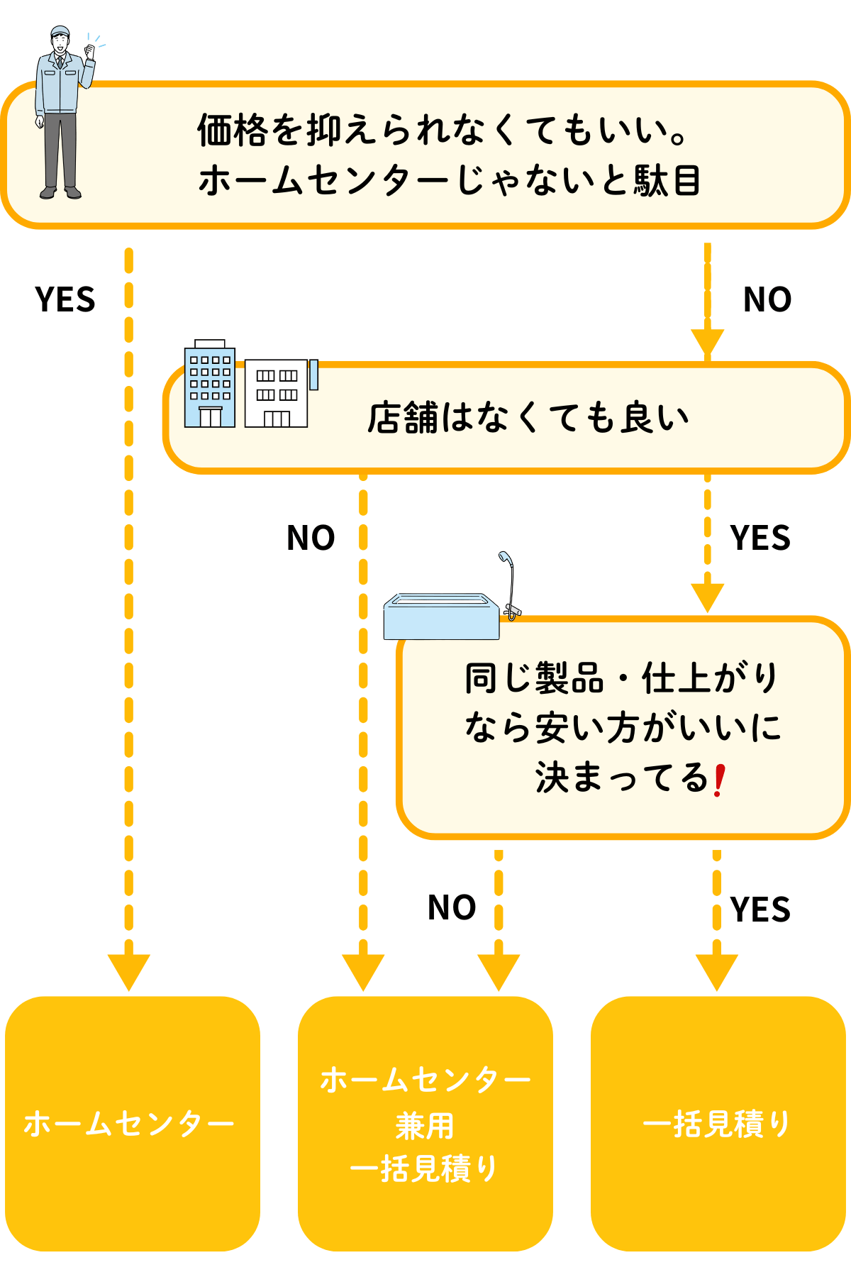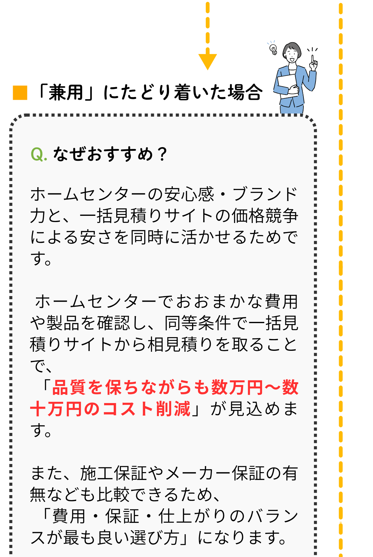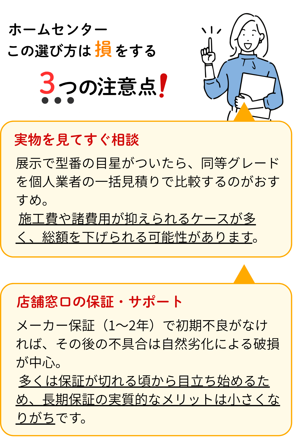 比較の結果、コストを抑えやすいのは専門業者への直接依頼です。ただし、ホームセンターは相談のしやすさや保証・ポイント特典が魅力で、総額で拮抗することもあります。