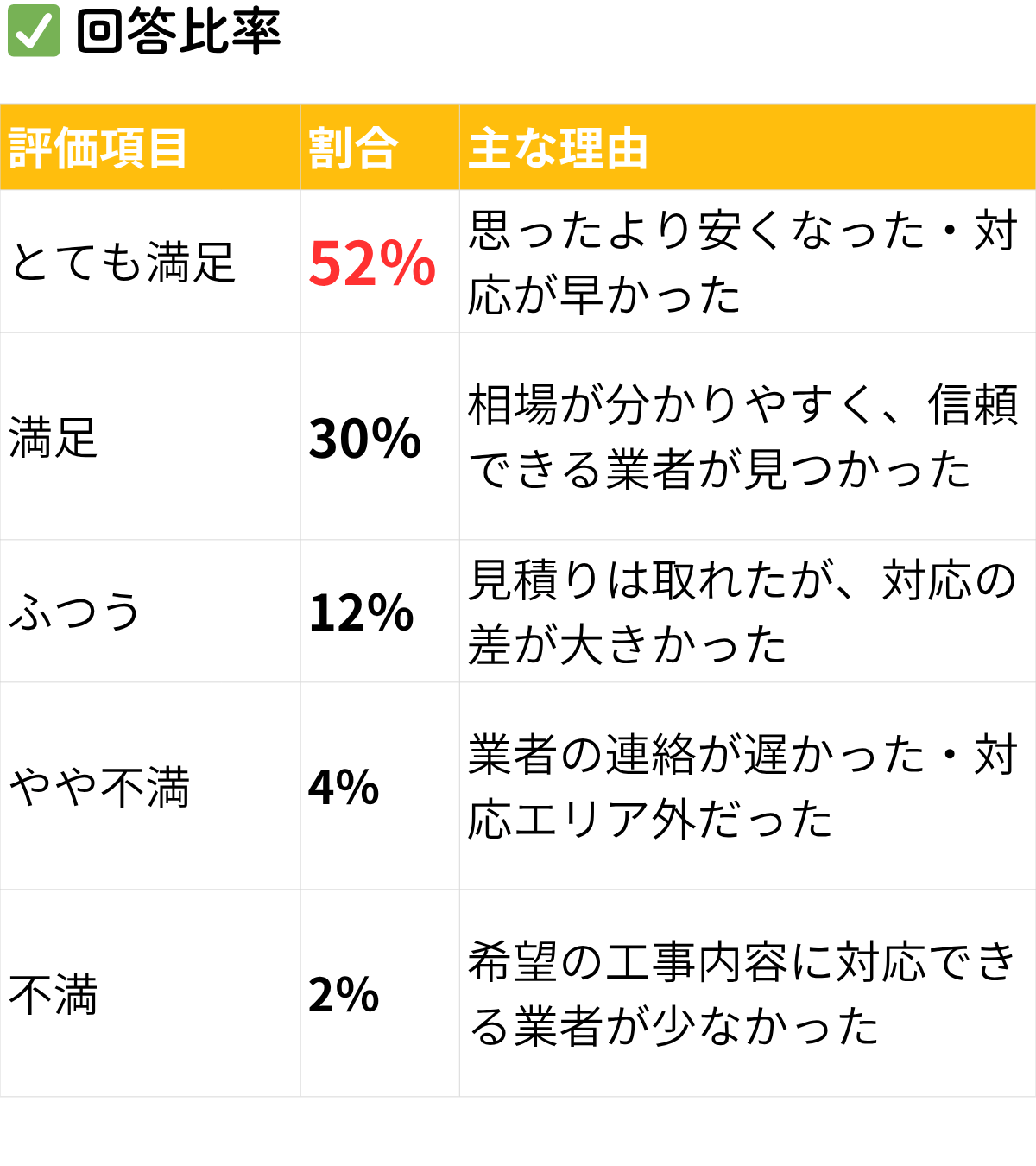 結果的に、気になっていた業者から見積もりを取ることができ、納得のいく仕上がりと価格、さらには業者さんの対応や人柄にも大変満足しています。