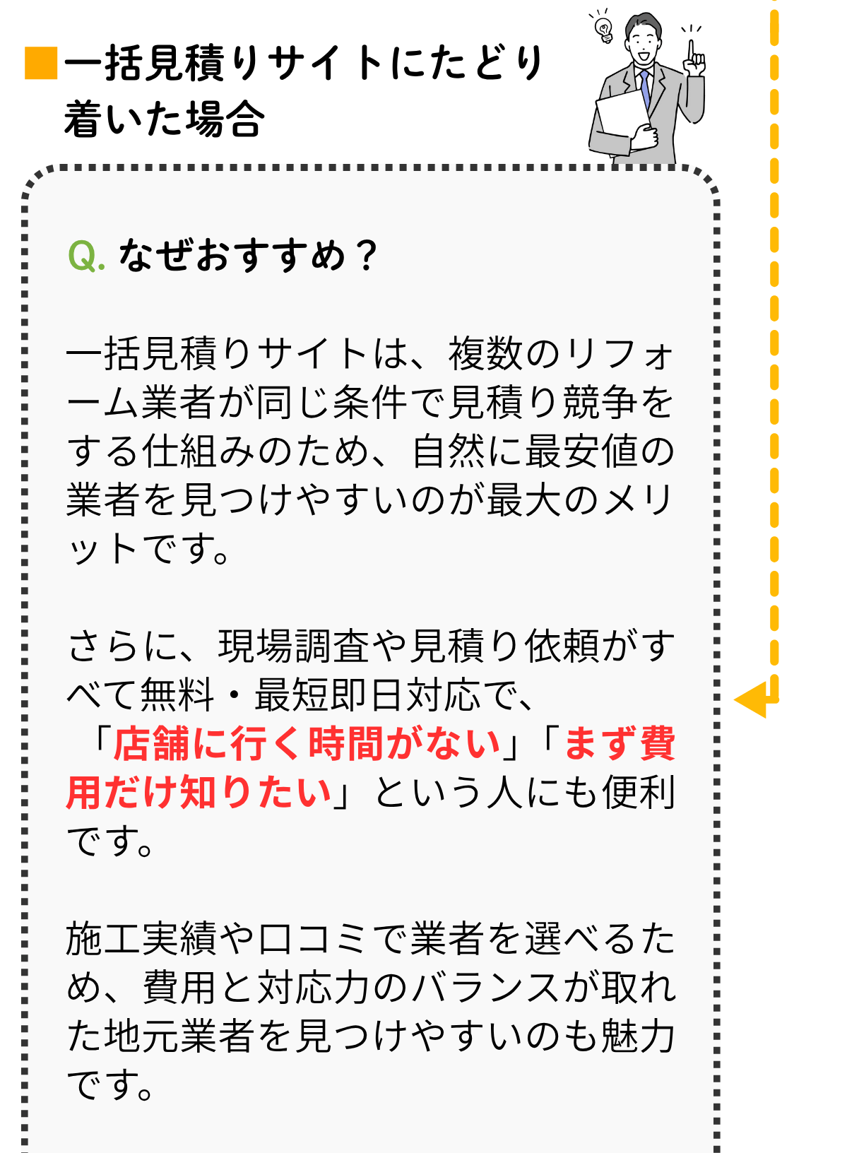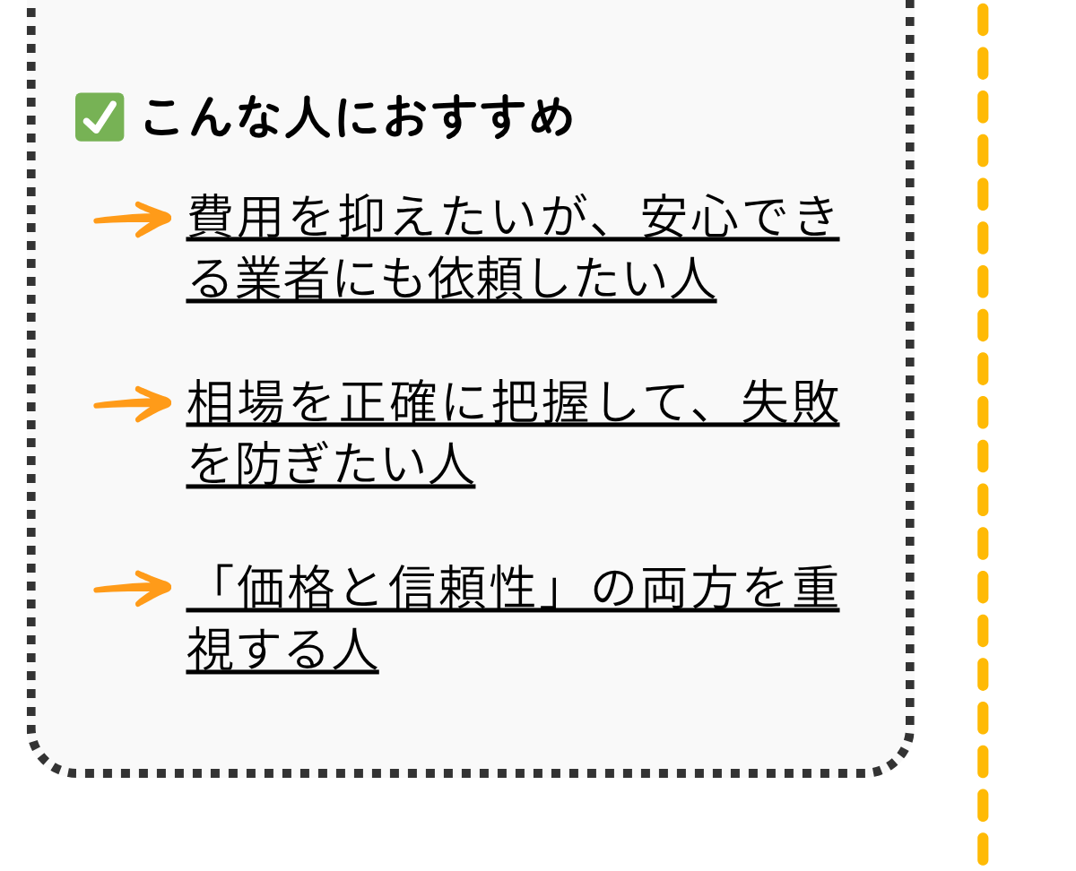 直接交渉の手間を省きながらも、適正価格で質の高いサービスを受けられる仕組みを提供してくれます。