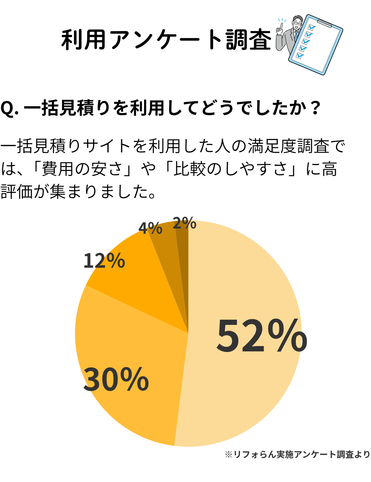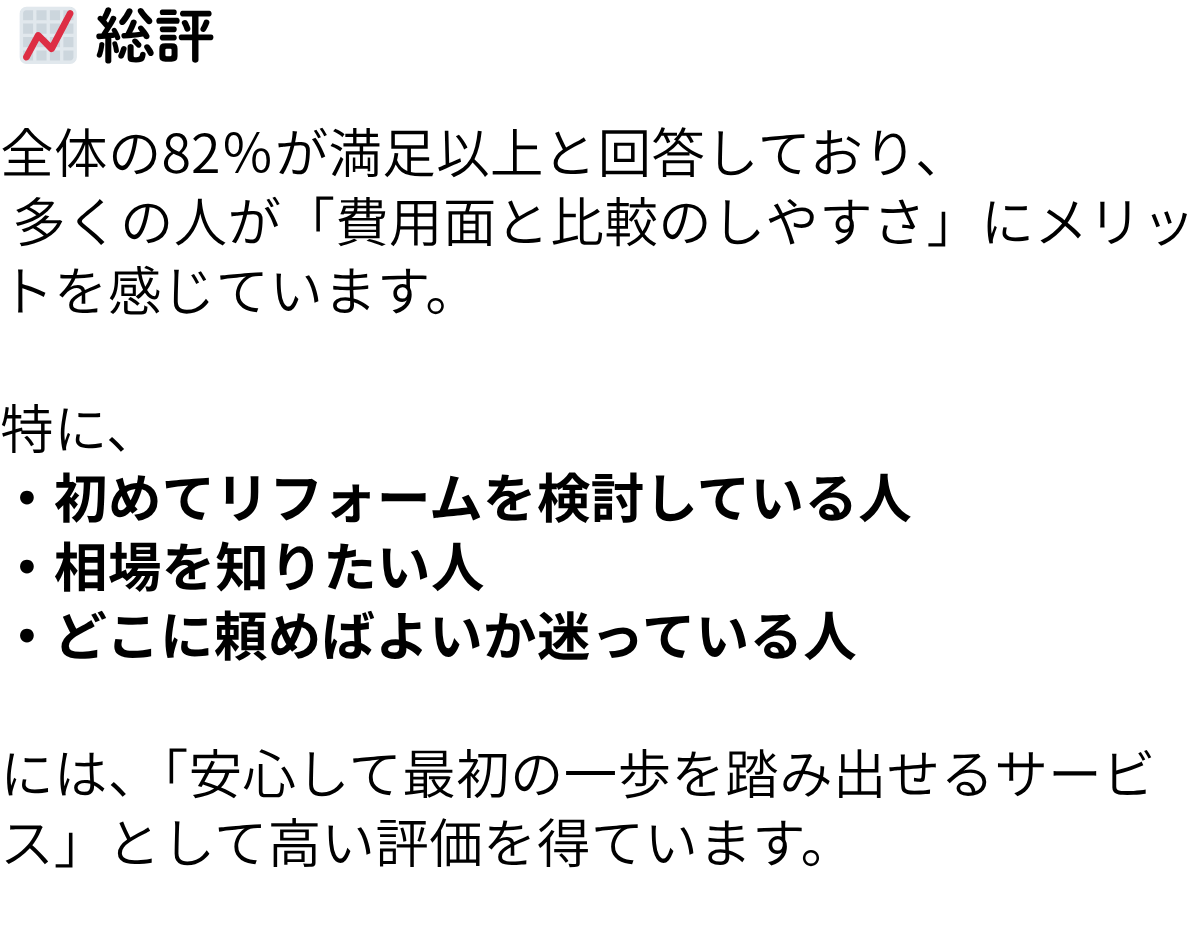 工事のメリットデメリットを詳しく説明してくれ、納得できる形で見積もりを取ることができました。また、複数の業者を比較することで予算内で希望通りの工事が可能になりました。