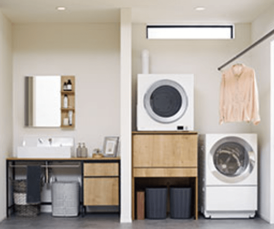 洗濯や家事動線を効率化するランドリールーム商品も用意されています。大容量収納やカウンター設置で、快適な家事空間を演出します。