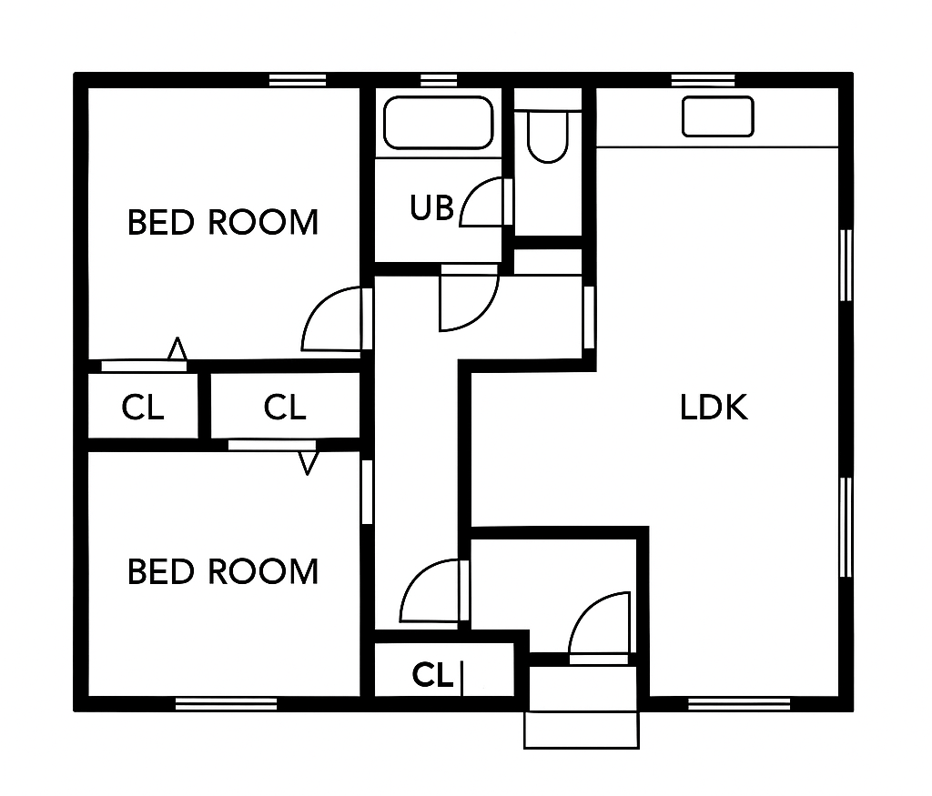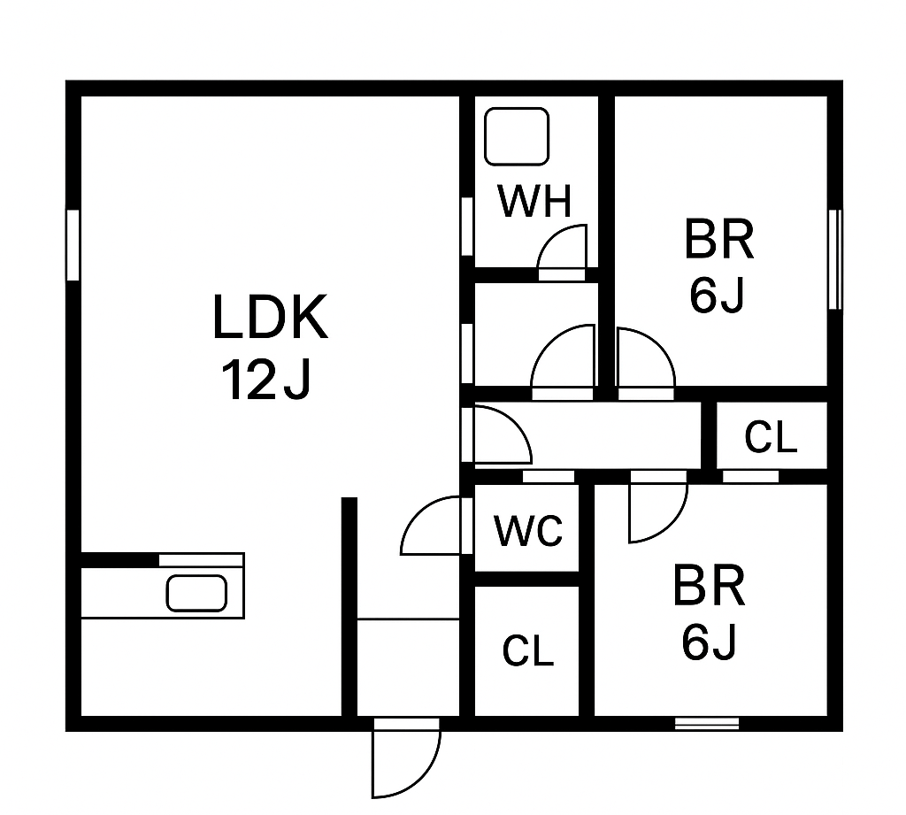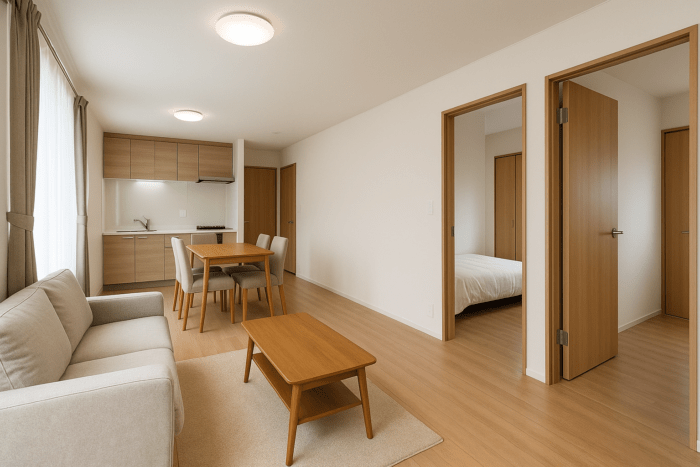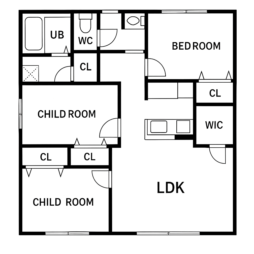 シンプルな2LDK構成。LDKはややコンパクトですが、家族3人までなら不自由なく暮らせます。収納は少なめのため、造作家具や壁面収納で工夫すると快適に。