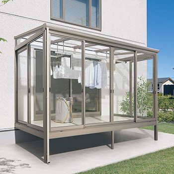 | 晴れもようwith (テラス囲い/ランドリースペース) | ・床仕様・アール屋根[2間×6尺] ・洗濯物干しに特化、換気・通風機能を強化 ・独立タイプあり ・竿掛け標準装備 ・耐積雪:約20cm/50cm/100cm対応 | 約100.6万円~ |