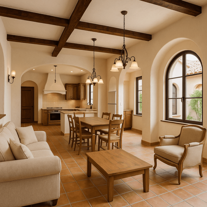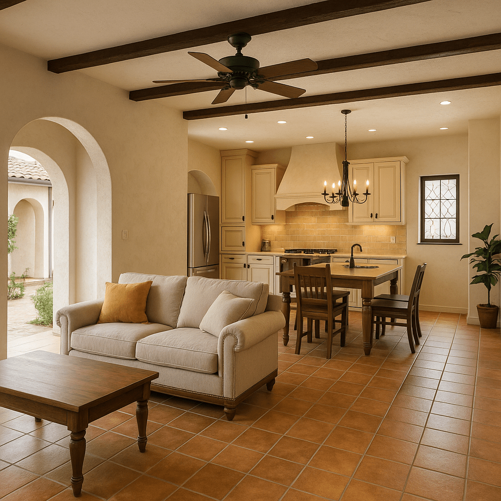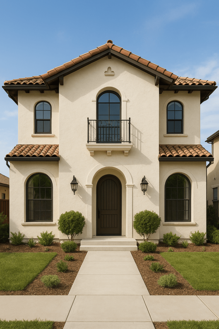 壁にはスタッコ仕上げを採用し、屋根は赤瓦、窓にはアイアン格子をあしらうなど、陽気で開放感のあるデザインが特徴です。南カリフォルニアの太陽と気候にマッチするスタイルで、明るい外観と曲線を生かしたフォルムが魅力です。