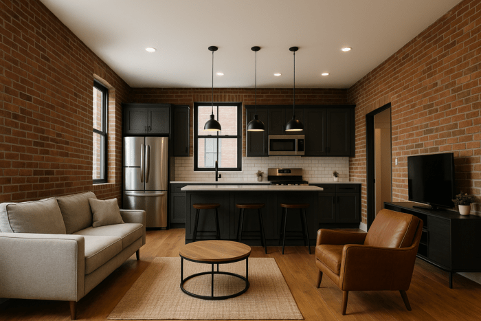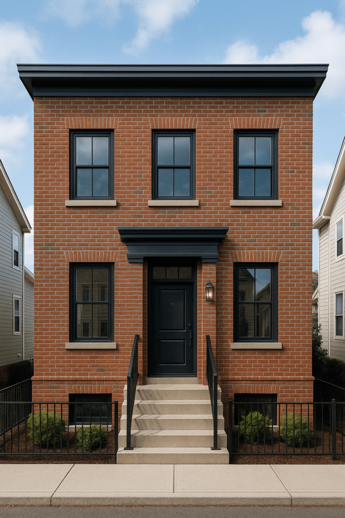 フラットな屋根と直線的で正方形に近いシルエットを持つ住宅。外観には赤レンガやサイディングが用いられ、ブルックリンやマンハッタンを彷彿とさせる都会的でモダンな雰囲気を演出します。