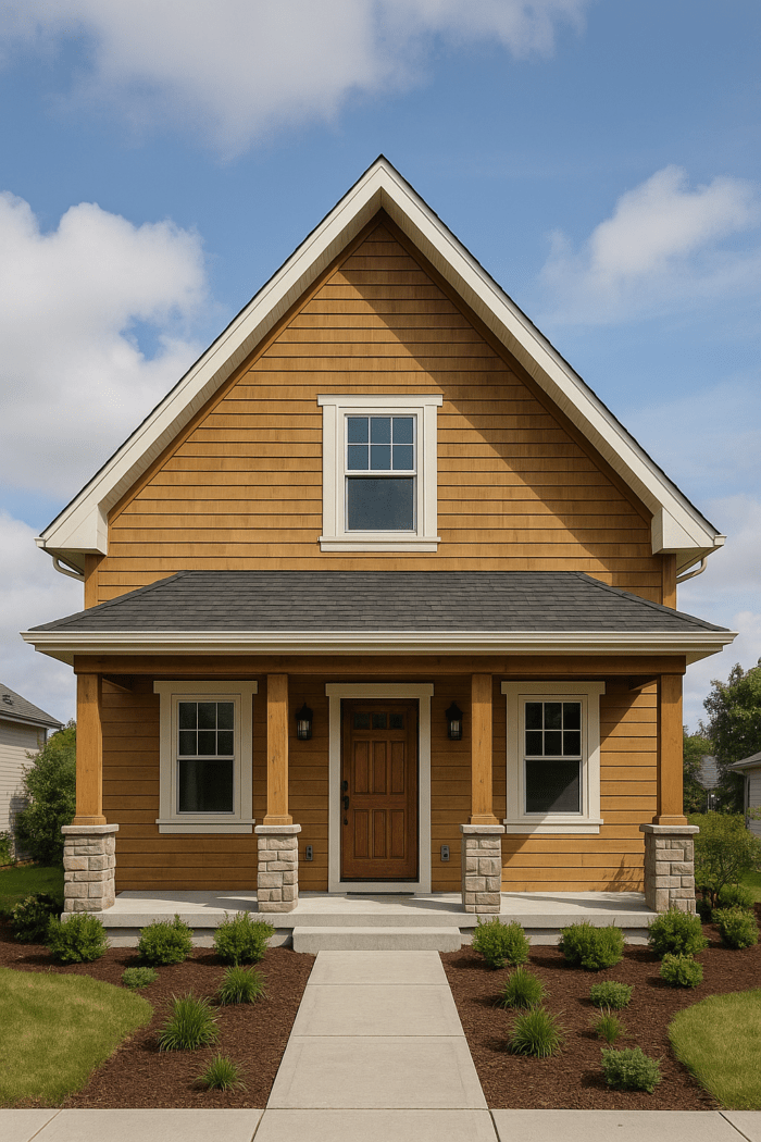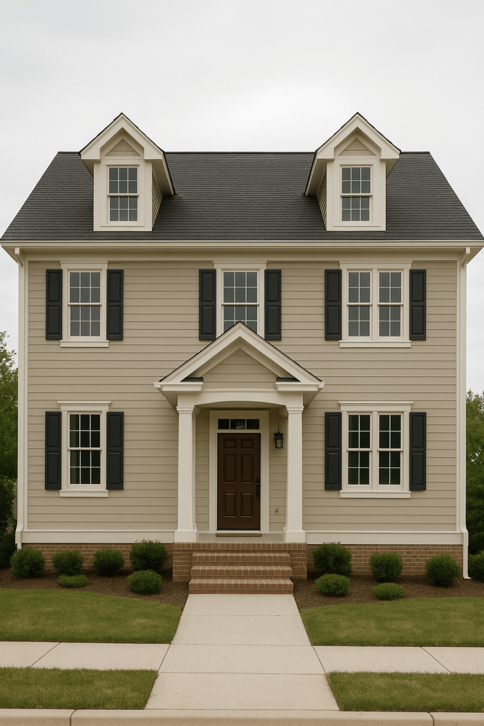 横張りの板を少しずつ重ねて仕上げる「ラップサイディング」が特徴的です。屋根にはドーマー窓を設置し、クラシックで落ち着いた印象を与えます。アメリカ建国初期の住宅デザインをモチーフにした伝統的な様式です。