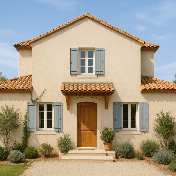 フランス南部のプロバンス地方をモチーフにした住宅。白や淡いベージュの漆喰壁、赤茶色の瓦屋根を組み合わせ、温暖な気候に合うナチュラルで落ち着いた外観が魅力です。