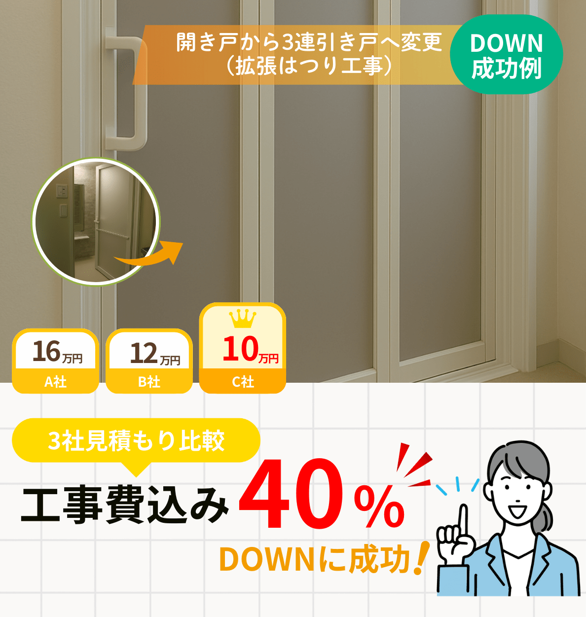 ※はつり工法は、カバー工法に比べ、扉に隣接する壁の補修や既存扉の撤去の費用が必要となるので高くなりがちです。【POINT】3連引き戸は、バリアフリー扱いとできます。要介護者がいるご家庭の場合は、補助金の申請が可能となるので、忘れず申し出るようにしましょう。