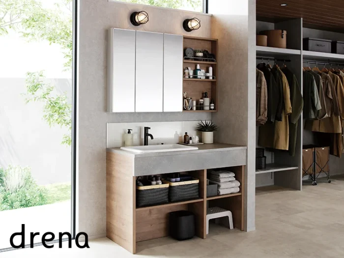 ![]() ドレーナ 2025年8月発売 | 造作風を手軽に/素材・意匠重視 | 陶器製広ふかボウル/ベッセル式、木目調キャビネット、木枠一面鏡(収納付)、タッチレス水栓、タッチレス照明、きれい除菌水 | 約37万円〜(税込) |